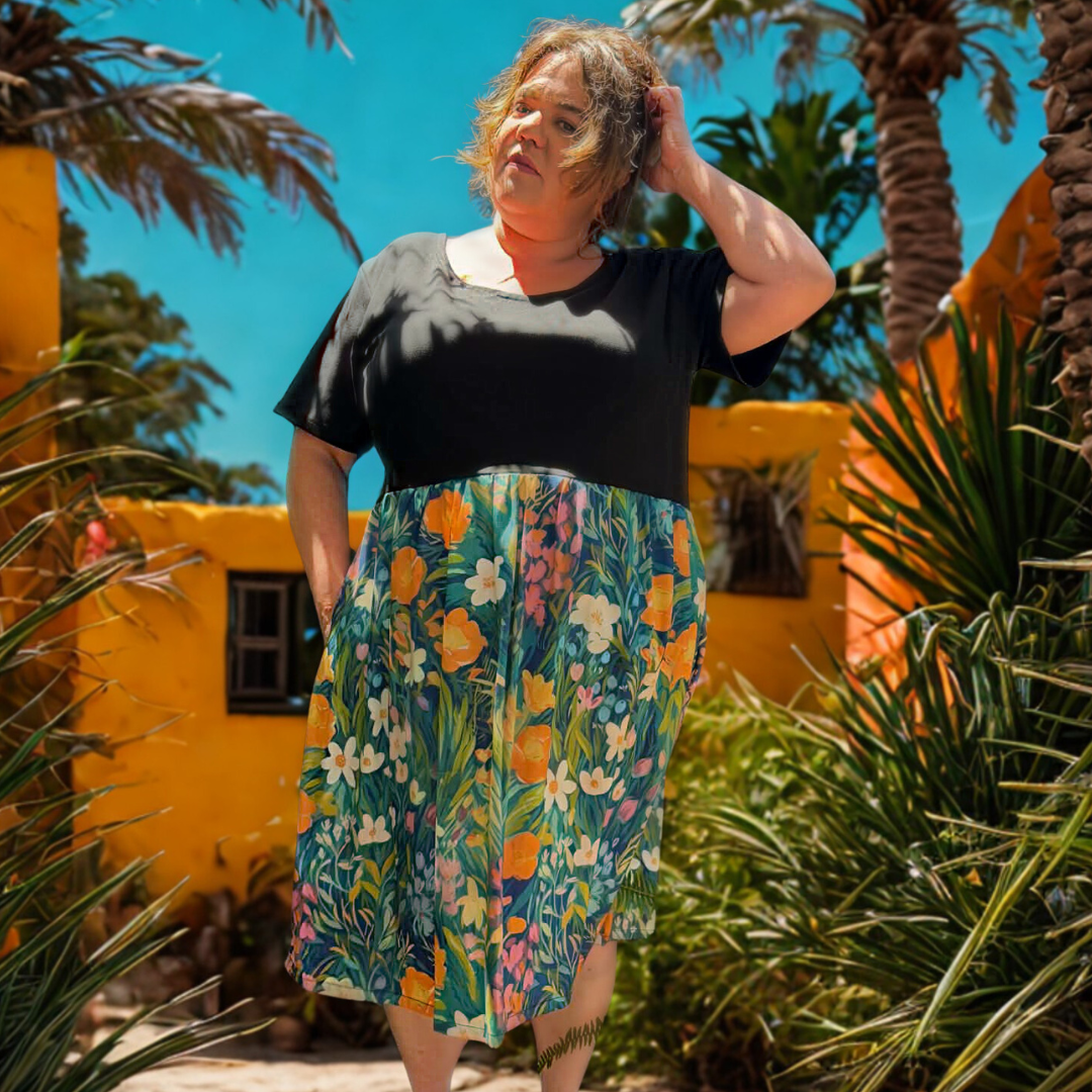Built from the most loved Short Sleeve Stretch Frock pattern (yes, the comfy one everyone is obsessed with), this style keeps the soft stretch bodice you love and adds a 100% cotton skirt for extra movement and that classic smock feel. It’s the same fit you already know from the stretch frocks, with 5cm extra bodice length for a little more coverage and ease. The comfort is unmatched and the fit is generous. If you’re between sizes, size down. Trust me.