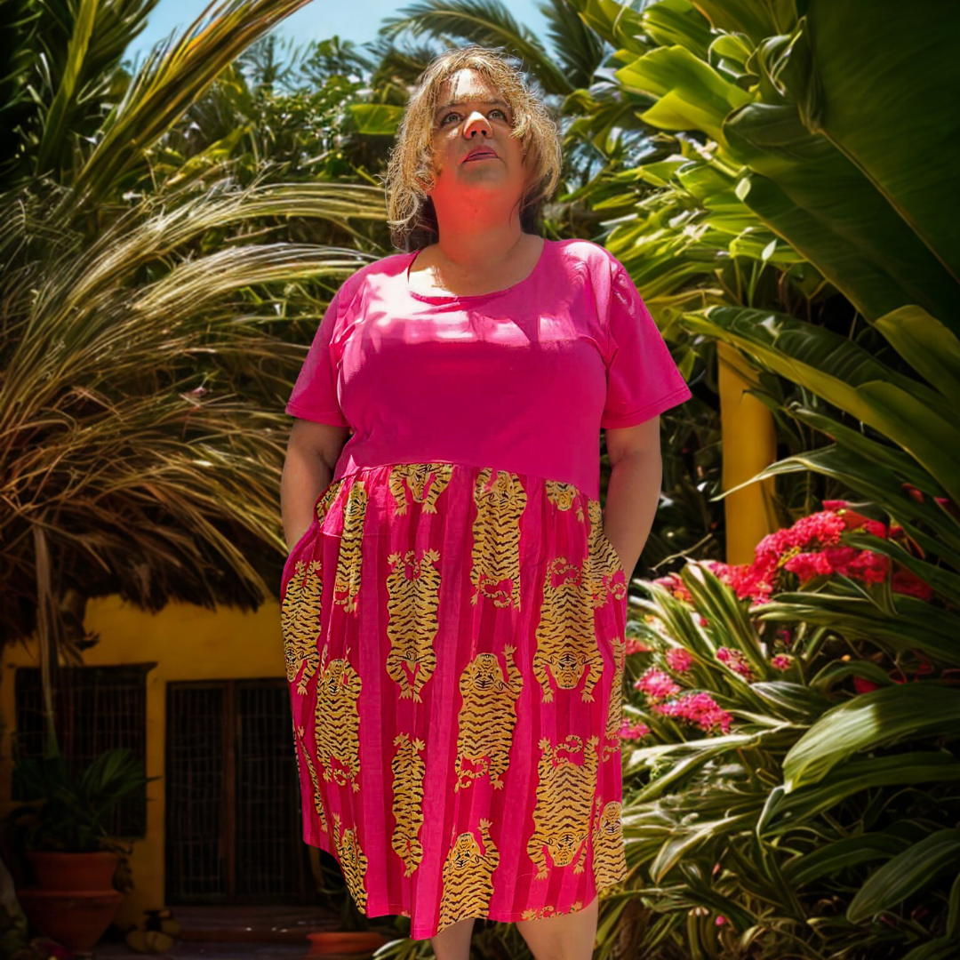 Built from the most loved Short Sleeve Stretch Frock pattern (yes, the comfy one everyone is obsessed with), this style keeps the soft stretch bodice you love and adds a 100% cotton skirt for extra movement and that classic smock feel. It’s the same fit you already know from the stretch frocks, with 5cm extra bodice length for a little more coverage and ease. The comfort is unmatched and the fit is generous. If you’re between sizes, size down. Trust me.