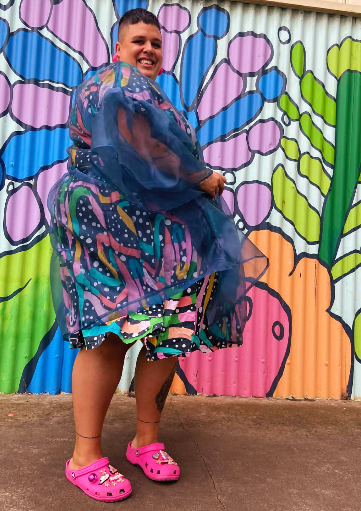 Made to order in Adelaide in sizes 6–30, using a silhouette based on the classic OG Frock. In the photos, Lauren wears a size 28 Overgasm Frock with 5cm longer dress length.
